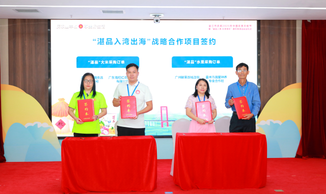 “湛品”品牌再添丰富内容,不仅赢得了本地消费者的喜爱,更吸引了众多来自粤港澳大湾区采购商的关注。“湛品入湾出海”战略合作项目签约在现场举行,广州绿秧田食品有限公司、广东海稻红农业科技有限公司等8家企业和组织签约,采购大米、水果、畜禽、金鲳鱼等“湛品”产品,签约金额达五千万元,将推动更多“湛品”供应大湾区市场。